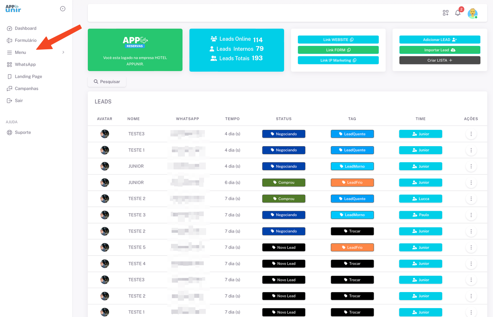 - Para acessar o link curto clique em menu.