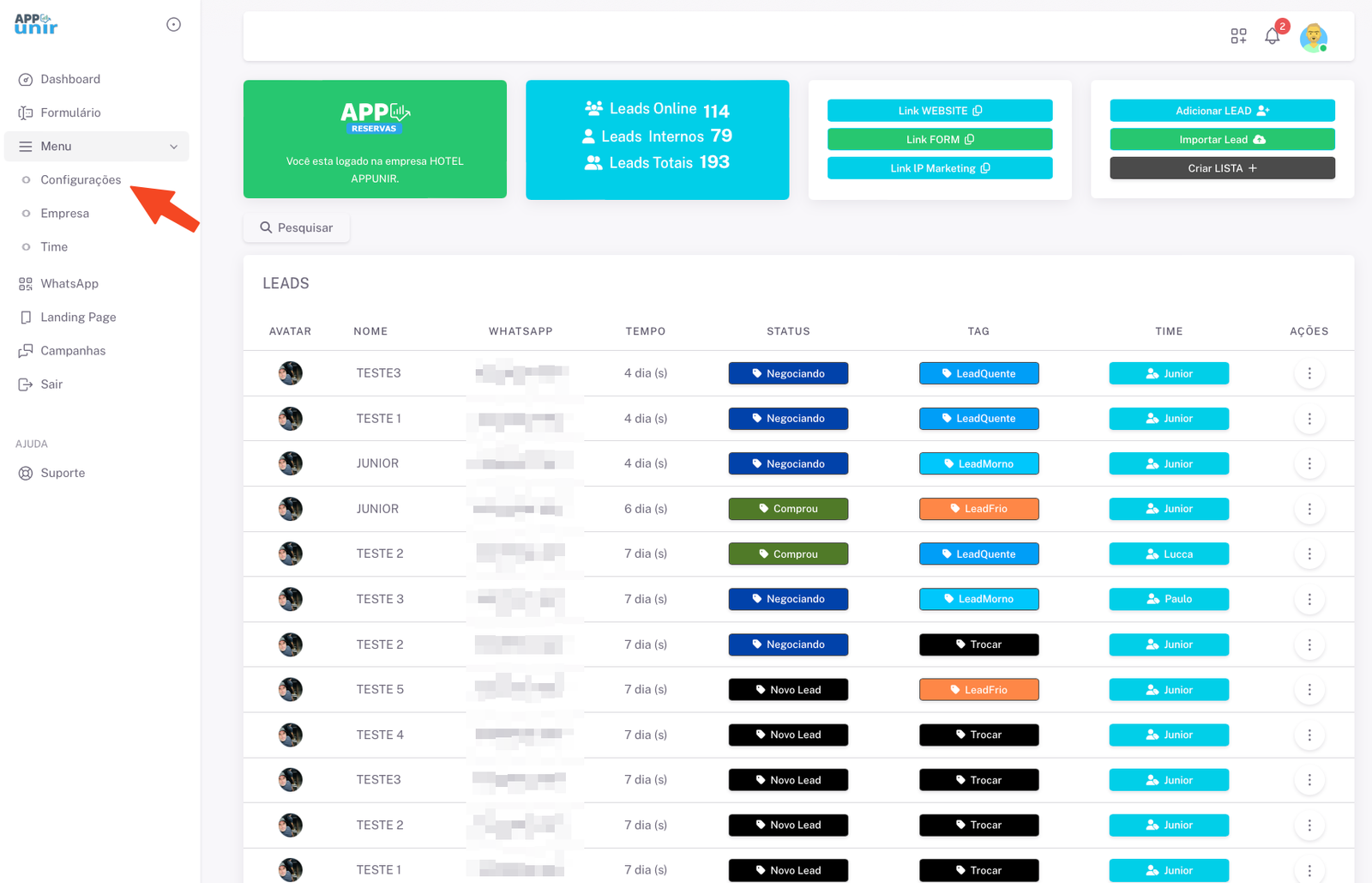 2. Depois clique em configurações.