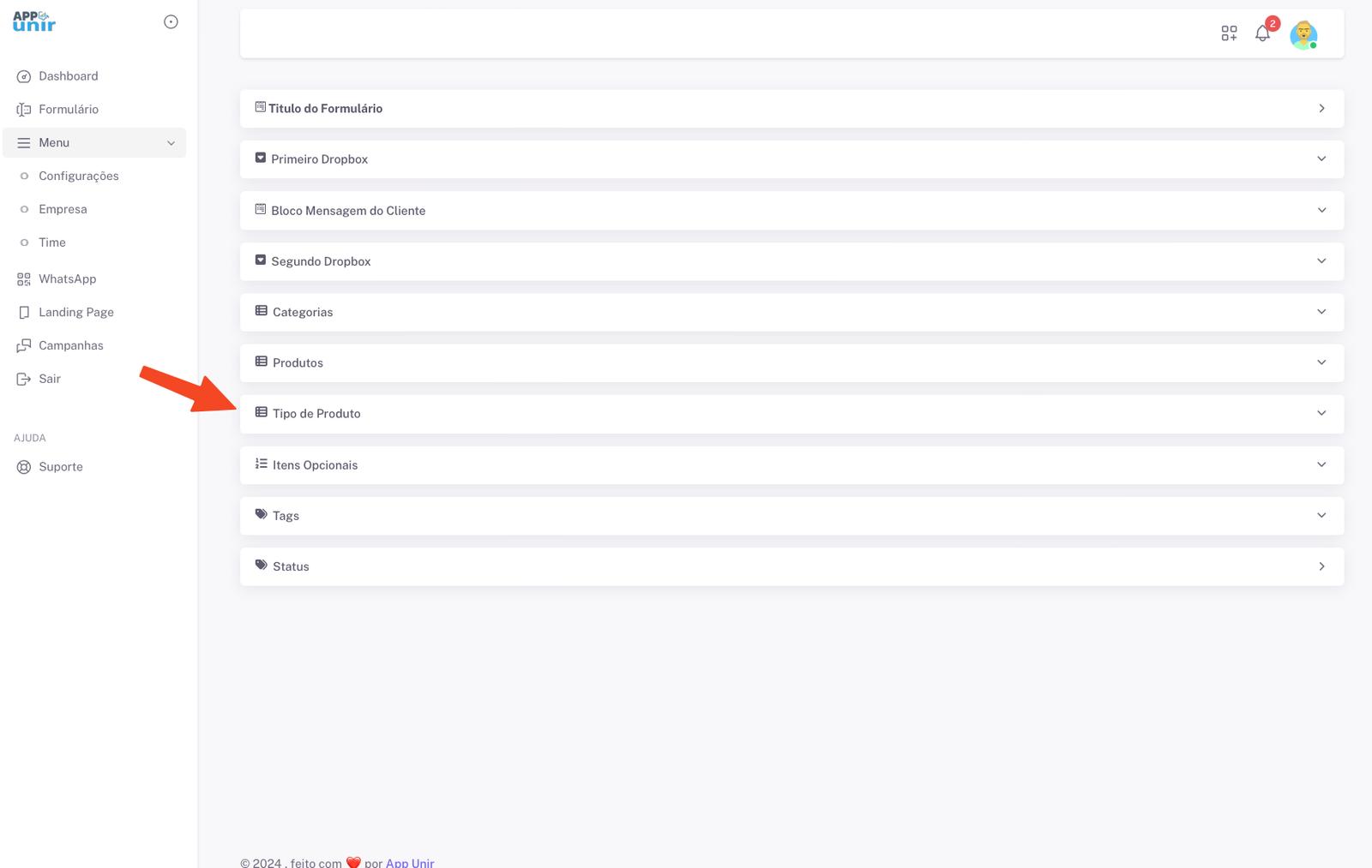 3. Para acessar tipo de produto.