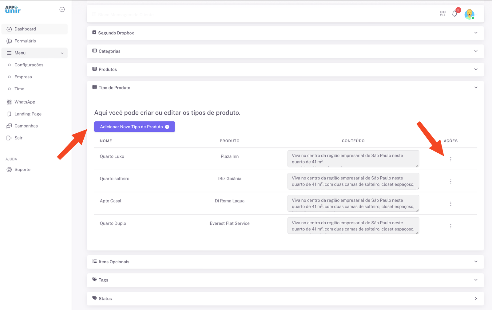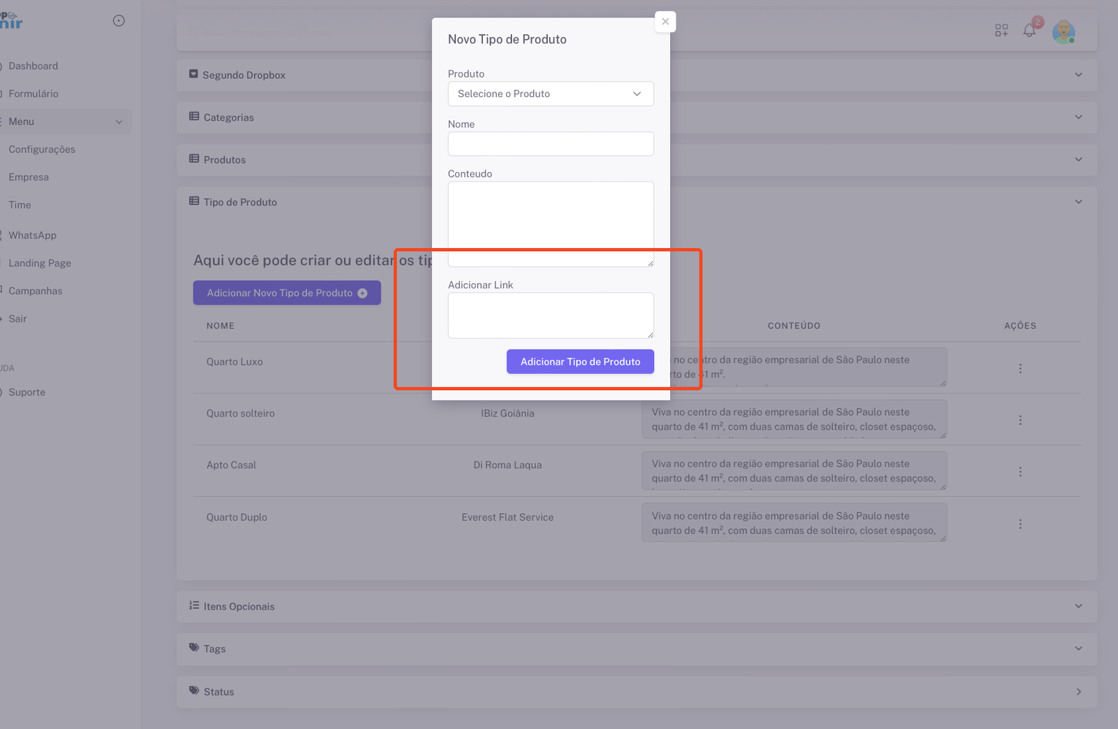 4. Voce tem a opção de criar um tipo de produto novo ou editar um ja criado anteriormente.