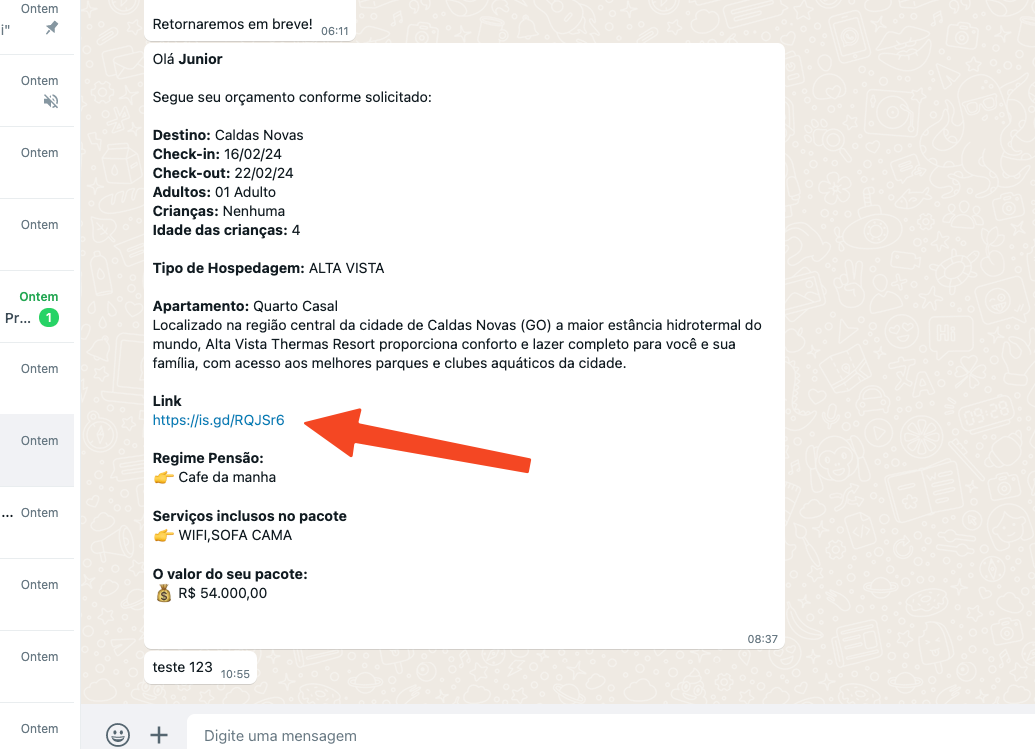 5. A sua resposta será enviada para seu lead com um link curto para o destino criado por você.