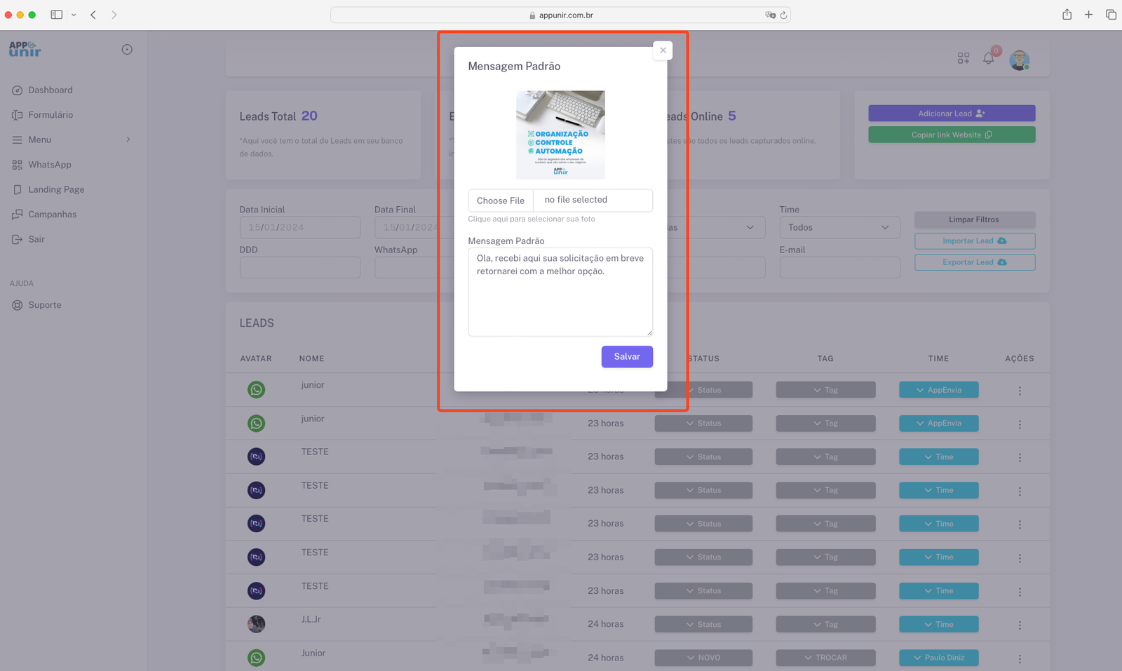 3. Agora voce consegue escolher uma imagem para ser enviada com sua mensagem e padronizar a resposta da sua mensagem.